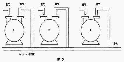 第二,多臺(tái)水環(huán)泵不采用排氣管道串并聯(lián)使用(如圖2),我公司目前多處使用該連接方式,而是采用單臺(tái)泵單用排氣管。 |