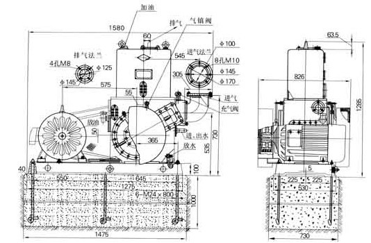 1、H滑閥式真空泵底座應安裝在混凝土的基礎上,基礎的四周應留有5至10厘米的槽溝,防止放油或放水時沾污工場。